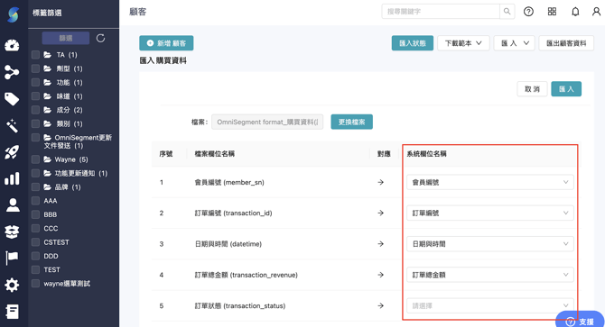 1.前往「顧客」頁面,將整理好的檔案上傳至系統,選擇【匯入】→【購買資料】。