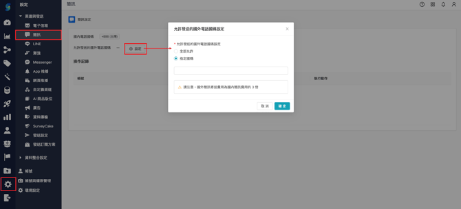 2025年11月28日 系統是否可發國外簡訊?費用如何計算? OmniSegment 系統支援寄送國外簡訊,可依收件者手機號碼的國碼進行跨國發送,如有跨國傳送簡訊需求,可於系統內預先設定欲使用的國碼。 一、設定路徑 「設定」 → 「簡訊」 → 「允許發送的國外電話國碼」 可選擇「全部允許」或填入「指定國碼」 二、費用計算方式 國內簡訊一則計為 1 點(70 字為限) 國外簡訊(非+886國碼)發送點數是國內簡訊的 5 倍,詳細費用可與客戶經理確認。