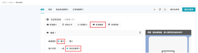 於編輯畫面點選【新增輪播】,輪播類型僅支援「圖卡」。