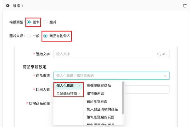 選擇商品來源「個人化推薦」、「全站商品推薦」。