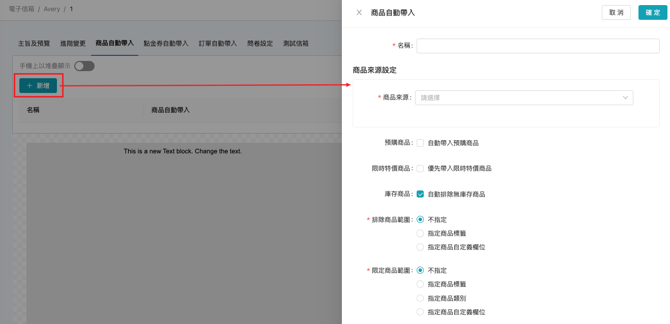 若無勾選此欄位自動帶入的商品只會以商品供應狀態為「in stock」,若有勾選「自動帶入預購商品」才會帶出商品供應狀態為 in stock、available for order 及 preorder 的商品。
