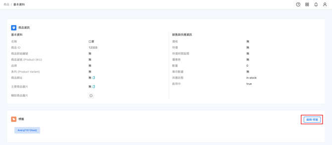 2. 開啟商品詳細資料頁後,找到「標籤(Tags)」欄位進行編輯。