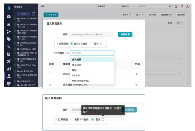 - 匿名:無需指定合併欄位,可直接匯入訂單資料;不認列於任一顧客身上,僅作為訂單紀錄使用。
