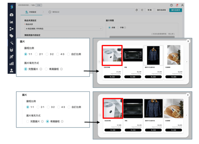 商品推薦模組,新增以下「圖片」設定:- 圖框比例設定:支援 1:1、2:1、3:2、4:3 及自訂比例