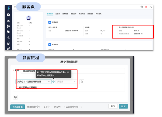 計算時機:當有最新一筆訂單成立時,系統即重新計 - 顧客旅程新增「消費回購預測日」節點