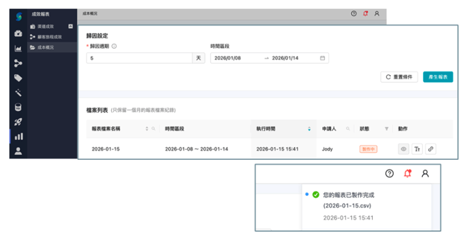 成本概況報表調整為由系統於背景自動進行資料計算,提升報表產出穩定度。
