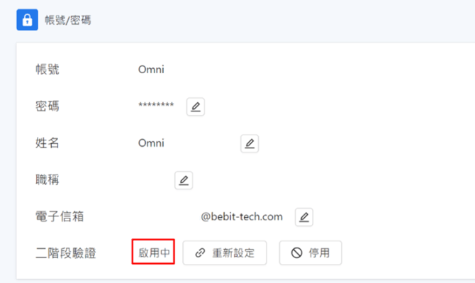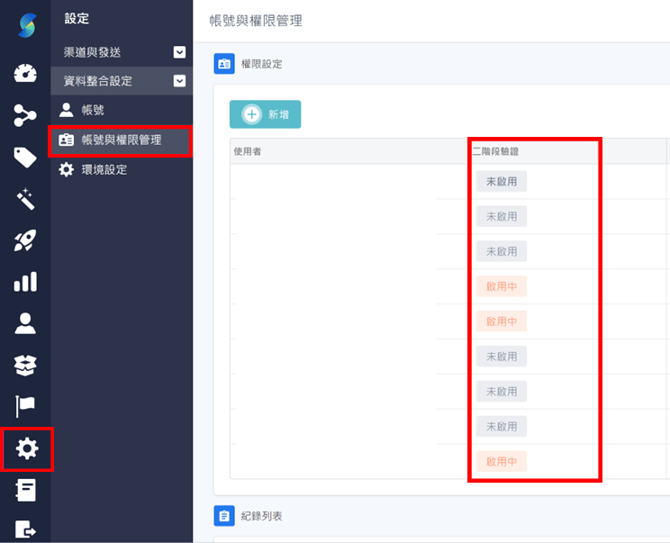 7. OmniSegment 帳號權限管理者,可至「設定」→【帳號與權限管理】頁確認所有使用者是否已完成二階段驗證。