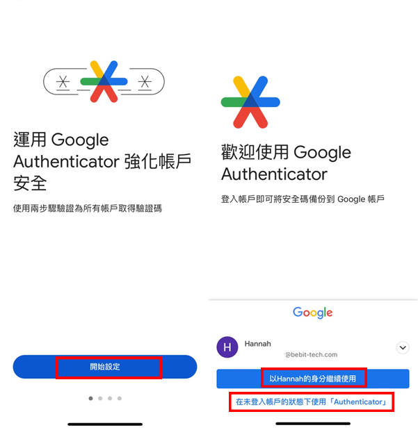 3. 進入 Google Authenticator App 後,點選【開始設定】,可使用 Google 帳號身分或點選在未登入狀態下使用。