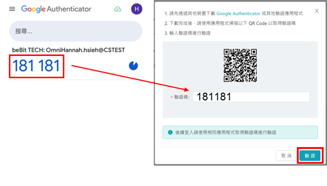 5. 掃描完成後,將 Google Authenticator App 顯示的驗證碼輸入於 OmniSegment 系統頁中並點選【驗證】。