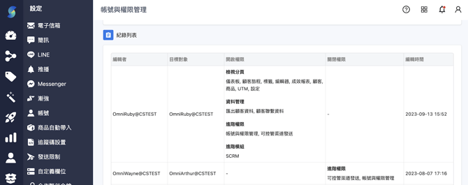 帳號異動歷程會記錄在頁面下方的「記錄列表」,顯示編輯者、目標對象、開啟/關閉權限及異動時間。