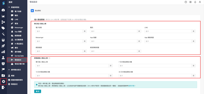 針對不同發送管道(如 Email、LINE、SMS、App Push),個別設定「單日最多可發送訊息數量」。