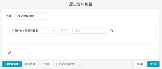 OmniSegment 中顧客旅程內的「歷史資料追蹤」節點篩選「 消費行為 / 預期消費日」條件。